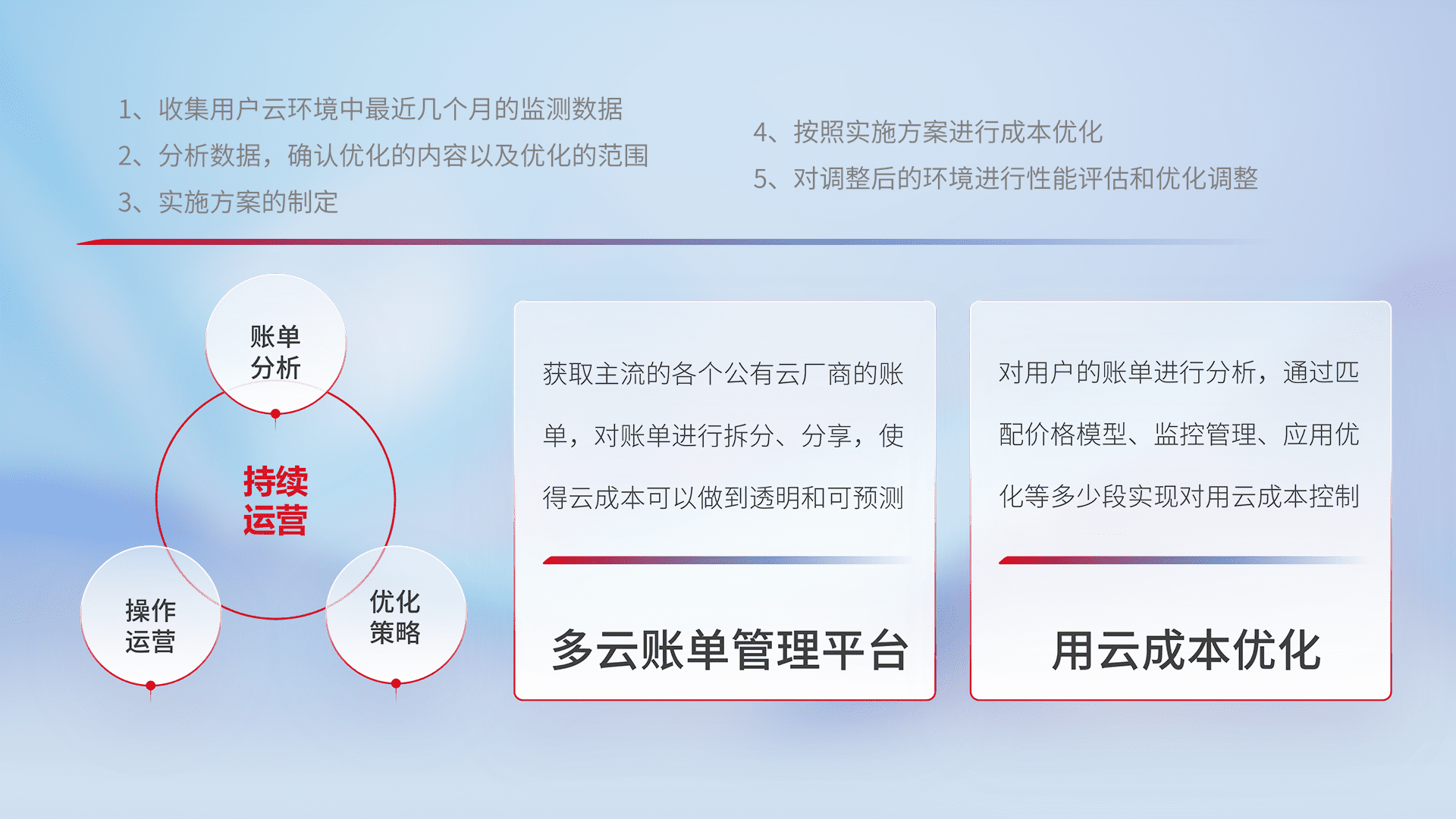 通过多云纳管,,以统一的资源数据模型把客户的云资源进行抽象和封装,,进而实现对多云资源的统一操作,,保障云资源管理的可靠性、、、、稳定性与可用性。。。。量身定制化运维内容,,,配置、、开发运维、、、、补丁管理、、、备份、、监控、、认证和访问管理、、、、审计和日常巡检等,,,保障在用云过程中的可靠度,,,,稳定度以及高可用率。。。。